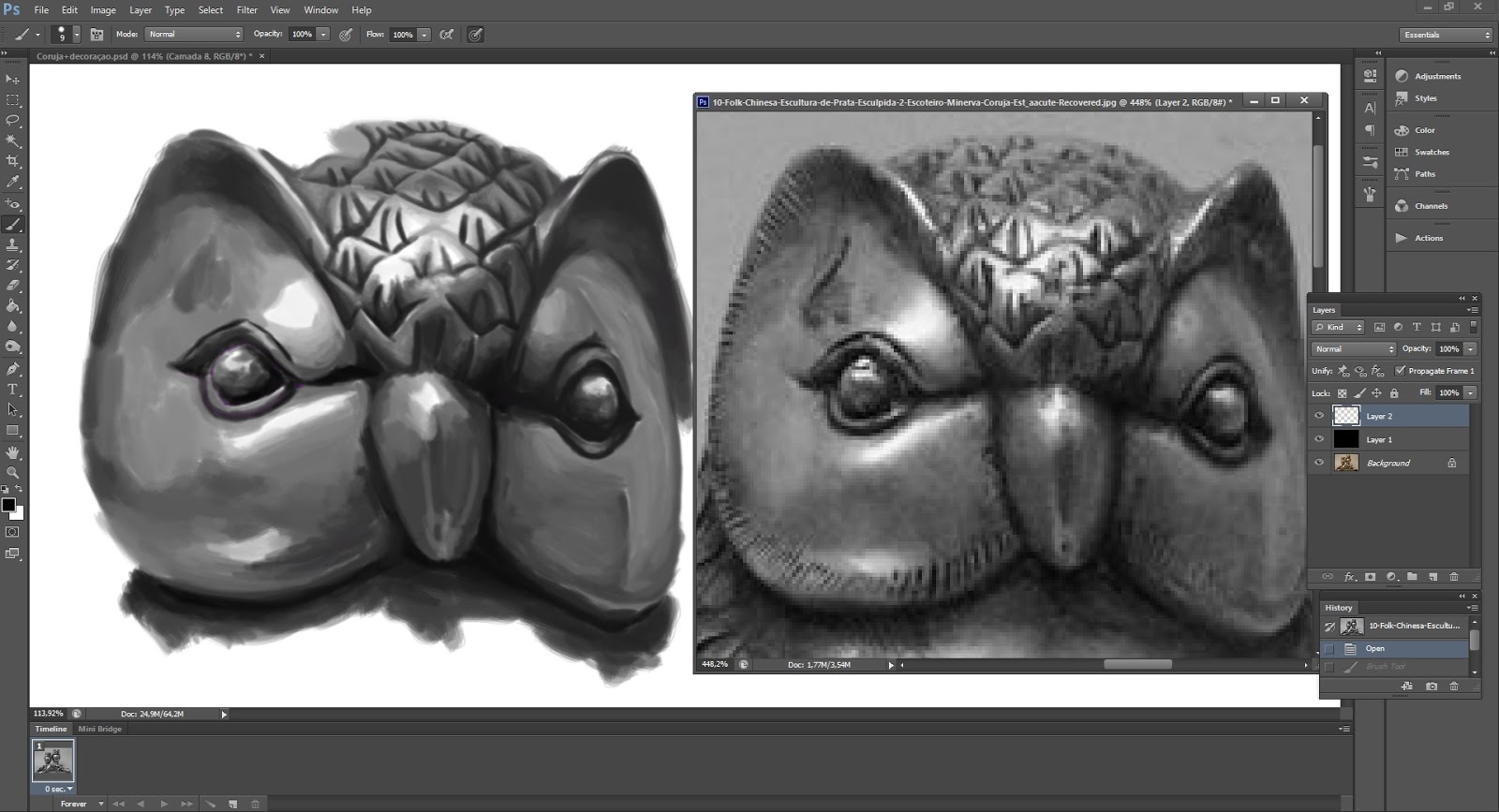 Esse desenho é um pouco diferente em relação ao que eu desenho. Eu fiz esse desenho para a minha aula de pintura digital. Era preciso escolher a imagem de um objeto, para então a recriarmos em preto e branco, já que o intuito do trabalho era fazer com que treinássemos as diferenças de iluminação e sombra. Eu escolhi, então, a foto de uma escultura de uma coruja, por achar que seria um desafio interessante e também por gostar de corujas.